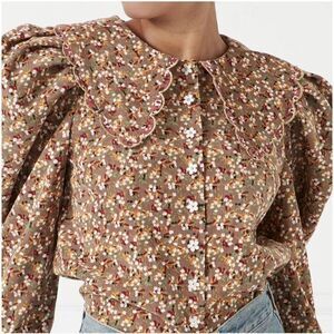 Brown Virginia cord floral peasant blouse with spread collar and puff sleeves. Gingham trim scalloping. Metal flower buttons up the front.Really fun details.