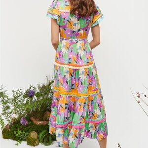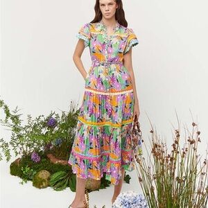 This stunning sundress features a tiered ruffled design in vibrant purple and orange hues, perfect for a wedding guest or cocktail occasion. The dress is adorned with a charming peter pan collar and flutter sleeves, creating a playful yet elegant silhouette. Its midi length adds a touch of sophistication, making it an ideal choice for resort wear.