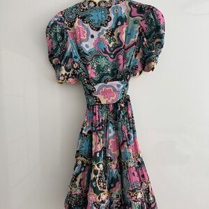 Vibrant floral dress with puff sleeves. Features a mix of colors and patterns. Perfect for a bold statement.