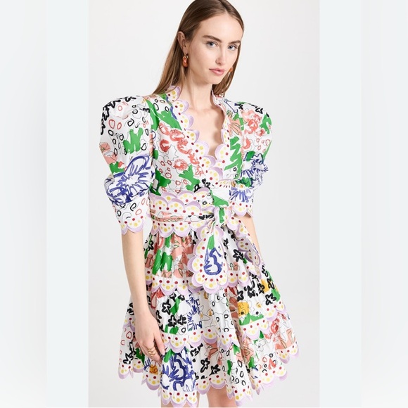 Vibrant mini dress with bold patterns. Features puff sleeves and scalloped edges. Perfect for a standout look.