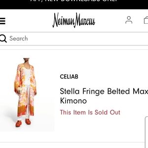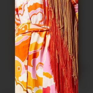 Vibrant robe with abstract patterns. Features orange and pink hues. Long fringe details on sleeves and hem. Perfect for lounging.