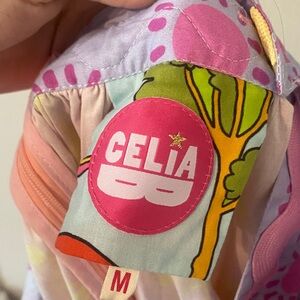 Vibrant CeliaB dress with ruffle sleeves. Features a mix of pink, blue, yellow, and green patterns. Perfect for a bold statement.