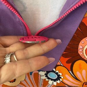 Adorable Celia B soft knit pullover sweatshirt in bright, psychedelic floral print. Half zip at the neck with logo zipper pull in metal, cotton knit.