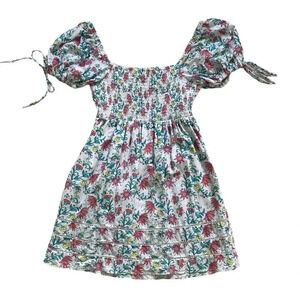 This dress features a beautiful Floral multicolor pattern, with elasticized puff sleeves, self-tie cuffs, dual side on-seam pockets, and a ladderstitch hem. Made from 100% cotton, this dress is both stylish and comfortable. It has a slip-on styling for easy wear and is approximately 32 inches from shoulder to hem per website.