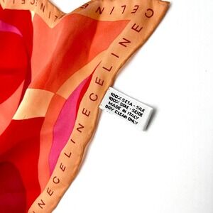 Keywords: Celine scarf, silk scarf, designer scarf, geometric print, red scarf, pink scarf, square scarf, logo scarf, Italian scarf, luxury accessory, vintage scarf, silk square, Celine silk, statement scarf