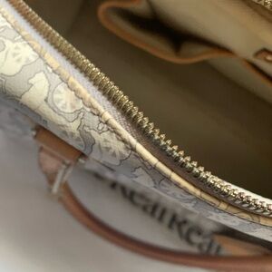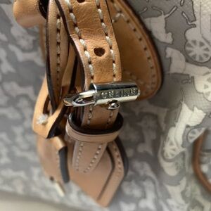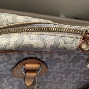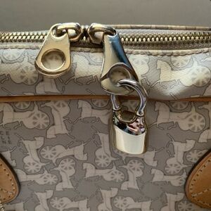 horseferry check, structured handbag, PVC leather, beige white gray, gold hardware, vintage designer, satchel style, multi-purpose, distressed, classic pattern