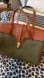 This elegant shoulder bag combines a rich brown leather trim with a durable green fabric body, offering a perfect blend of style and functionality. Its structured design and gold-toned hardware add a touch of luxury, making it an ideal choice for professional settings. Like new with minor blemishes. Clean!