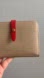 Elegant Celine wallet in beige. Features a bold red strap. Perfect for everyday use. Leather exterior and interior. Suede in the billfold area. Multiple card slots, zippered interior coin pocket. Made in 2017.