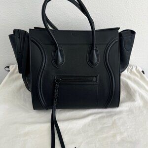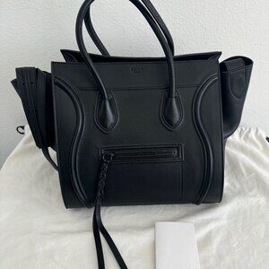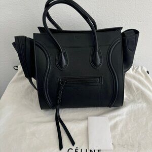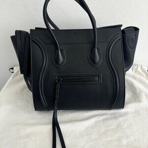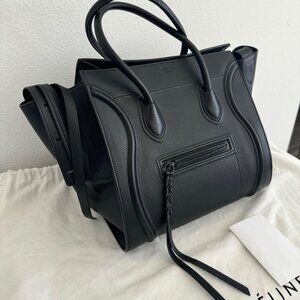 Selling my CELINE Calfskin Medium Phantom Luggage Tote in Black. Crafted from luxurious smooth calfskin leather, this stunning tote is in EXCELLENT MINT CONDITION and has only been worn out once. It features rolled leather top handles, Celine's signature scroll trim, and expandable sides, offering both elegance and practicality.