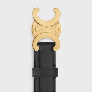 Elegant black belt by Celine. Features a gold buckle with signature design. Perfect for any outfit. Comes with original dust bag and box - in perfect condition.