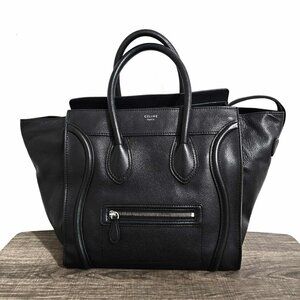Black pebbled leather exterior with silver tone hardware base, protective feet, zip closure, and top handles. Interior lined in black suede material with zip pocket. Made in Italy.