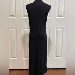 Exude timeless elegance with this sleek black sleeveless maxi dress by Celine. Crafted from a luxurious fabric blend, this dress features a clean silhouette with stunning silver button detailing along the hem, adding a refined touch to the minimalist design. Perfect for evening occasions or a chic day look.