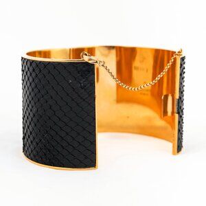Made in Italy, this wide bangle from Celine is crafted in a black snakeskin, and features gold-tone hardware, and a chained hook closure.