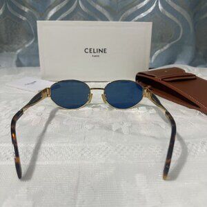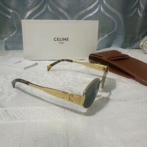 Stylish black sunglasses by Celine. Features gold accent on the side. Perfect for a chic look.
