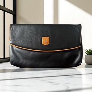 Celine Black & Tan Smooth Leather Large Triomphe Clutch Fold Over Flap Bag