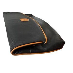 Authentic Celine Black & Tan Leather Large Triomphe Clutch Fold Over Folded Flap Evening Bag