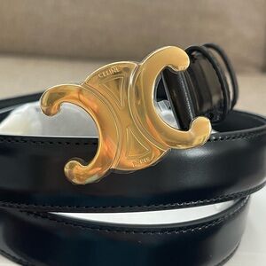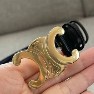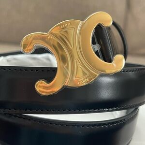 Elevate your style with the Celine Black Leather Belt, featuring a striking gold buckle. Perfect for adding a touch of luxury to any outfit.