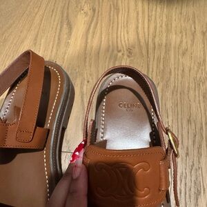 Stylish Celine sandals. Rich brown leather. Embossed logo detail. Adjustable strap for comfort. Comes with dust bag