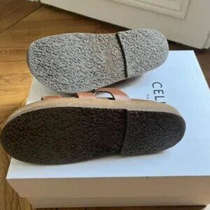 Crafted from rich brown leather, these Celine sandals feature multiple straps adorned with elegant gold-tone hardware. The leather-lined footbed offers comfort, while the light-colored sole enhances their sophisticated appeal.