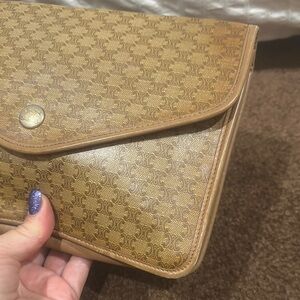 Celine brown monogram clutch with gold accents. Elegant and stylish. Gently used with fading on trim and slight fading on top front flap. Overall wear from general use. Good to use when traveling inside duffle or carry on/suitcase. 10”/7”/1.5”