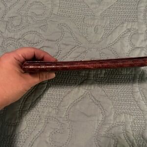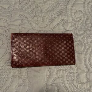 Beautiful leather envelope style long trifold wallet from Celine-Paris, approximately 7.5 x 4 inches, features soft burgundy leather with gold triomphe stamping and gold tone hardware with snap closure. Interior of burgundy leather and brown fabric has cardholders, two long pockets, and a zipper pouch. Good preloved condition with rubs/minor wear (see pictures). Made in Italy. Gorgeous authentic vintage Celine!