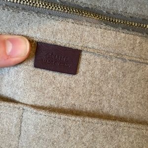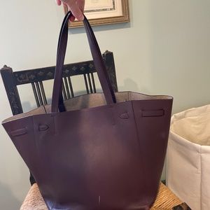 Smooth eggplant leather Celine cabas bag. Purchased around 2016. Front is free of any markings, one white mark along the backside. Oatmeal interior is pilling slightly along the bottom