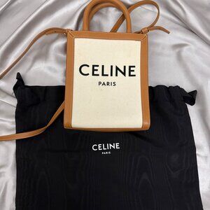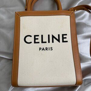 CELINE Canvas Calfskin Mini Vertical Cabas in Natural and Tan. This sleek tote is beautifully crafted of natural canvas with tan leather trim. The bag features tan leather top handles, an optional shoulder strap, and a black Celine logo at the center. The top is open to a spacious canvas interior.