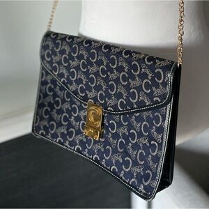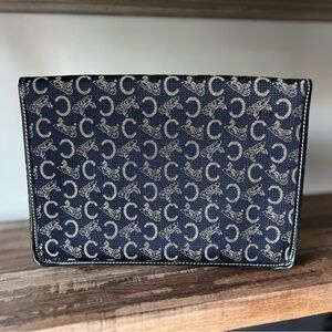 Vintage Celine pouch in blue canvas and stitched leather. Celine monogram and carriage theme, gold buckle with gold Celine logo signed C.