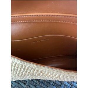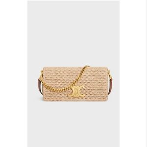 This Celine clutch in cream and gold exudes elegance with its woven texture and metallic chain strap. The luxurious gold hardware accentuates its sophisticated design, making it a versatile accessory for both casual and formal occasions.
