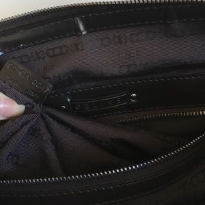 Gorgeous (Vintage) Celine leather handbag. Pictures show original purchase price and serial numbers. Pebbled leather with patent chocolate brown trim. No signs of wear or tear. Completely clean on inside of bag. Comes with storage cloth bag, adjustable shoulder strap and authenticity card. Barely used. I purchased from Norstrom about 10 years ago. Measurements: 18 inches long by 18 inches high (from top of handles to bottom of bag).