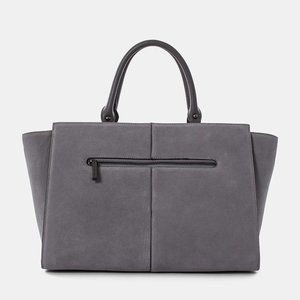 Gun metal-tone hardware.