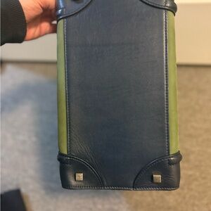 Rare excellent Like new condition Celine tricolor mini luggage tote with green, gray and blue design and gold hardware. Features top handles and front zip pocket. One zip pocket inside, open pocket and another small open pocket Ideal for everyday use. Only calls out I can find in a tiny black mark on front bottom right and a few superficial marks on the suede and leather. Don’t really notice unless you’re super close and searching for it. This bag is stunning! Approx measurements are L 12 x 11 H x 7 W