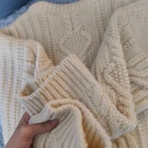Elegant ivory sweater with a striking navy emblem. Features intricate cable knit design. Perfect for layering.