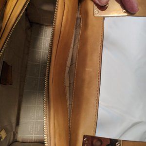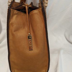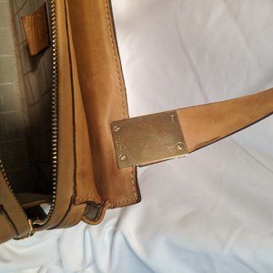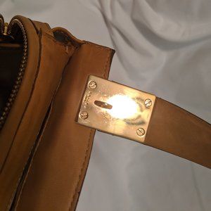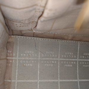Vintage (90s, I think) Celine Leather Convertible Handbag. This is a gorgeous tan, textured leather handbag. Interior is soft leather with a canvas/nylon type of liner. There is no cross-body strap but it would be easy to add a generic chain strap. This is a very old bag with the old Céline bar logo. There is some discoloration in the interior from the glue used to create the bag around the bottom insert. The insert is slightly lifting, and would probably be better easy for you to repair, if you wanted to, but it is still very sturdy and usable. There is an open pocket on both sides of the bag, with a center pocket with a zipper. Inside the pocket with a zipper is another small zippered pocket.