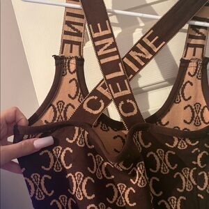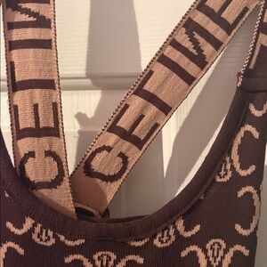 Elegant Celine dress with iconic logo design. Features rich brown and tan hues.