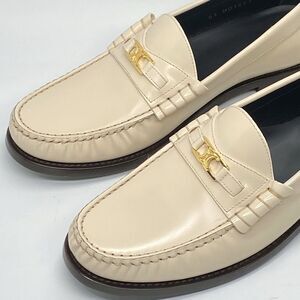 Rounded toe shape, traditional loafer construction with hand-stitched apron, gold colour celine triomphe signature, calfskin insole, leather outsole, blake construction.