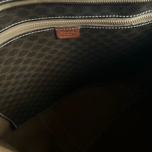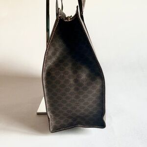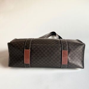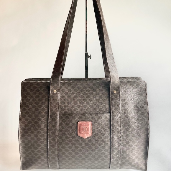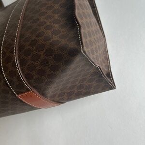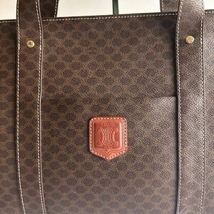 Celine Macadam Brown Tan Genuine Leather Hand Bag Shoulder Bag Business Bag. 15.5”W x 11”H x 5”D, handle drop 22”, zipper closure, gold metal hardware. In great condition, gently worn a few times, a few marks on the back of tote (see pictures).