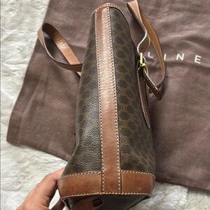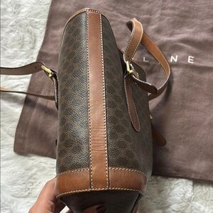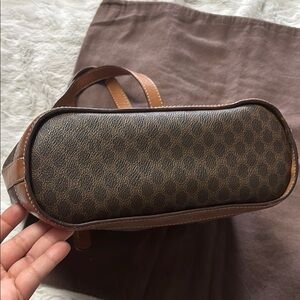 Elegant Celine tote with brown monogram design. Features tan leather straps and gold accents. This has an 8” drop at the current setting, but can be adjusted an inch shorter or longer. This is a vintage preloved piece it does show some wear. The gold tone from the hardware is faded and the leather has some darkening, but the inside is in great clean condition.
