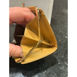 Vintage Celine macadam print coin pouch with gold tone hardware, tan leather trim/embellishments throughout, kiss lock closure at top and three interior pockets.