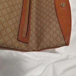 Celine Macadam Triomphe Canvas and Tan Leather Trimmed Foldover Envelope Clutch! Gold-tone hardware, single zip pocket under front flap, tonal leather lining, single interior pocket and snap closure at front flap.