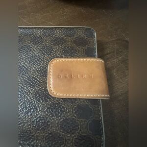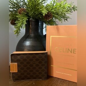 This unisex Celine wallet in the Macadame print is crafted in a durable coated canvas. The interior is all leather and features 4 cc slots, 2 slip pockets, 1 billfold slot and a coin compartment with a snap closure.