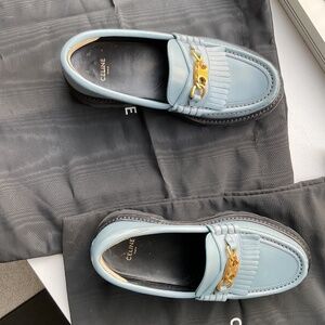 CELINE MARGARET LOAFER WITH TRIOMPHE CHAIN IN JEANS BLUE POLISHED BULL. Bulky toe shape with chunky iconic Celine triomphe gold chain on the apron; fringes; hand-stitched apron; calfskin insole; rubber lug outsole with tonal leather welt; 1.4 in (35 mm) heel. Worn only a few times (see slight scuffs); practically brand new. I added heel protectors on the inside (due to my very sensitive Achilles!), but they can be removed. Includes 2 pristine Celine dust bags. RE: sizing - I think they run a bit on the smaller size. Best for a US size 6 or 6.5, definitely not a 7!