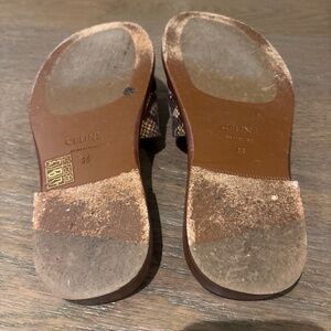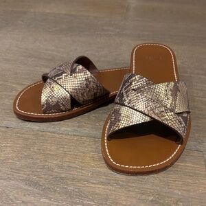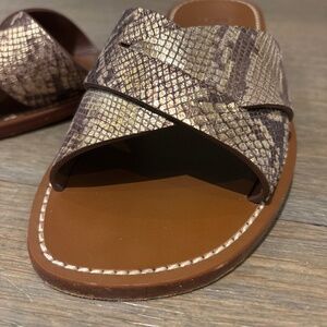 Leather, crossover slides. Gently worn. Mint condition. Metallic shimmer. A great wardrobe staple to elevate your look.