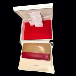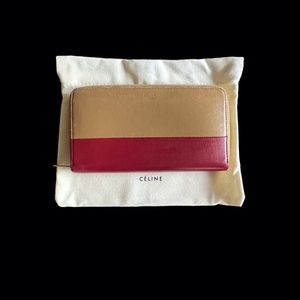 Celine large zipped wallet in Tan and burgundy color, leather, 12 card slots, 2 long gusset slots and zipper compartment.