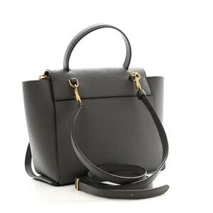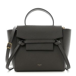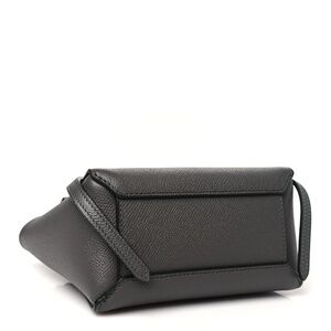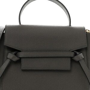 The CELINE Nano Belt Bag in dark grey grained calfskin leather embodies sophisticated elegance. Its structured silhouette offers ample space, complemented by a leather top handle and an optional adjustable shoulder strap for versatile wear. The flap, secured with a leather strap and gold-tone button, opens to a roomy interior lined with soft grey suede—perfectly balancing refined style with practical functionality.