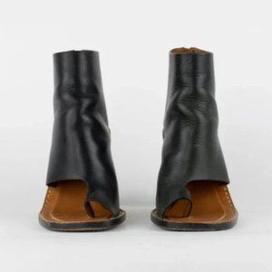 A uniquely designed bootie with Celine. These feature a luxurious leather upper sole, open toe with and toe ring detail, silver block heel with a back zip.