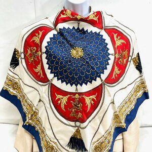 The Celine Paris 100% Silk Scarft , satin Blue Ivery Gold Red Bow Chain Art is a luxurious and stylish accessory designed in Italy. This square scarf features an art/floral pattern with a vintage touch, perfect for adding a touch of elegance to any outfit. Made from high-quality silk fabric, this scarf is 34" in x 35" in and has a logo accent, making it a versatile piece for the summer, fall, and spring seasons. Its multifunctional design can be worn as a neck warmer or neck accessory, adding a touch of sophistication to your wardrobe.