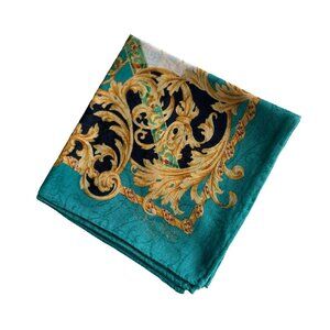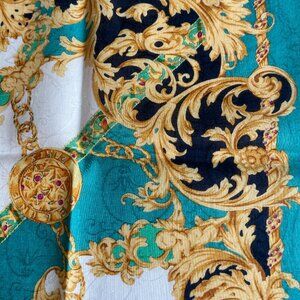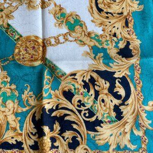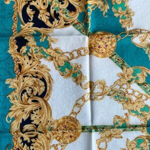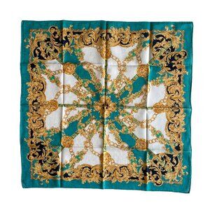 Elegant vintage Celine cotton scarf featuring an intricate baroque-inspired chain and scrollwork design in gold, set against a rich teal, navy, and white background. The scarf is finished with a rolled hem and measures approximately 20" x 20" (51 cm x 51 cm).