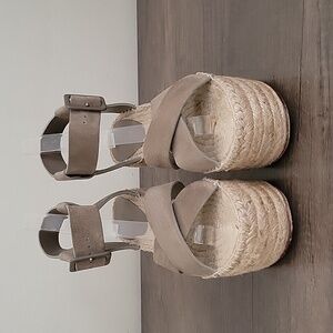 Celine Paris criss cross suede platform espadrille sandals. Beige / taupe. Made in Spain.