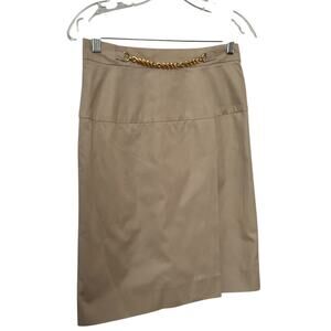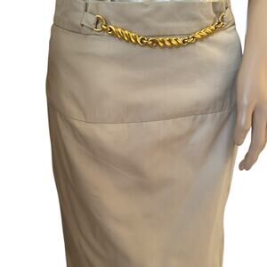 Beautiful Celine Paris khaki pencil skirt with with gold front faux chain link Embellishment. Back zipper and button closing and fully lied